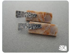 $50.00Lovely cream, rust and olive jasper rectangles suspended from long triangles, hand-textured with tiny circles.