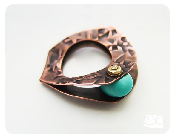 Another simple ring that will let us explore the use of another cold connection: the screw & nut. For the texture on this ring I used a hammer with a hand carved face. Making your own tools is another way to individualize your jewelry, and make truly one-of-a-kind pieces. To carve the face of the hammer you only need a metal cutting wheel on your rotary tool and a bench vise. This tutorial is an instant downloading PDF file, it has 6 pages, 15 photos, a template and plenty of tips. The tutorial is for beginners and intermediate students.